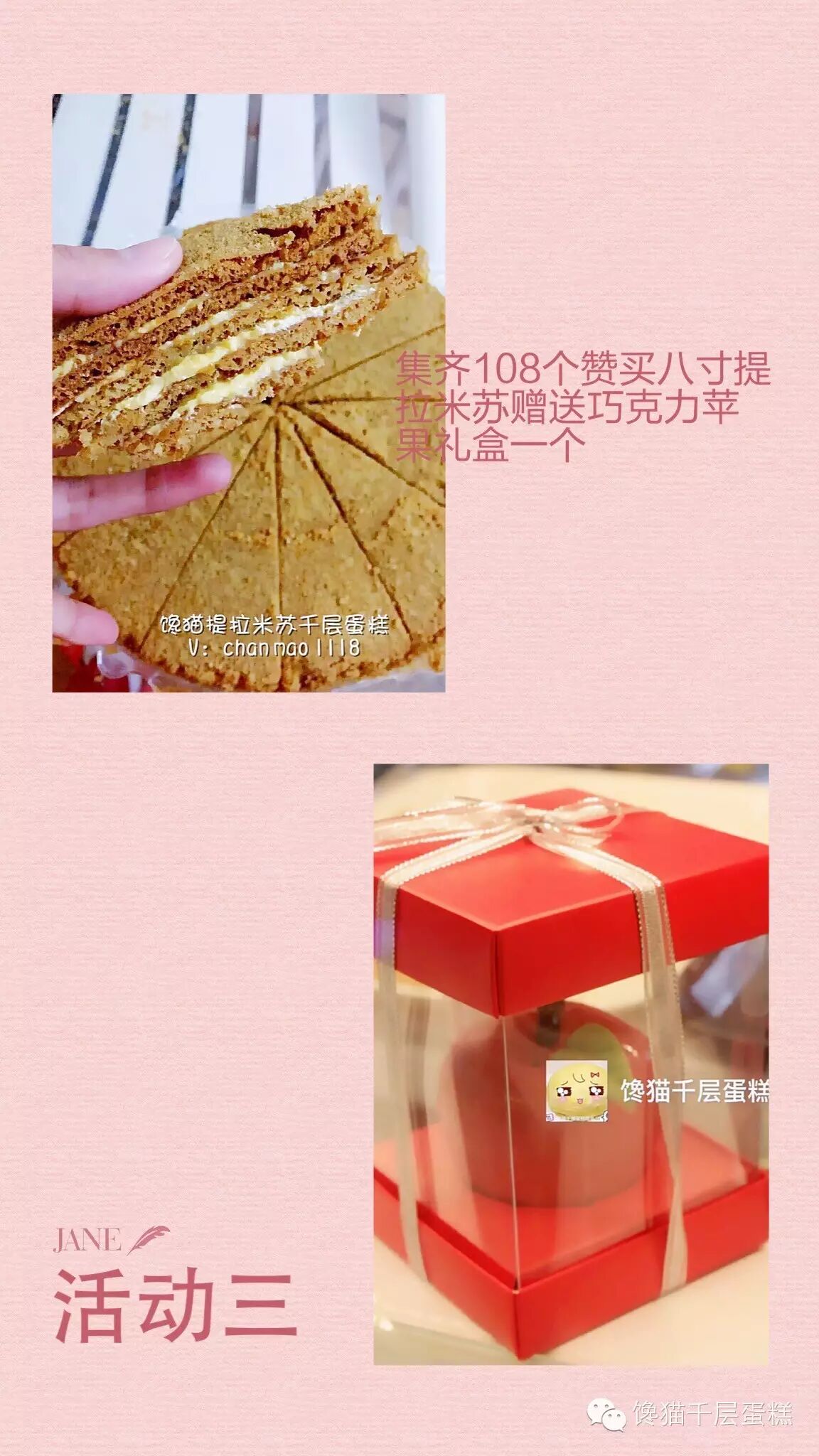 活动三:转发此链接集齐108个赞,购买提拉米苏赠送巧克力苹果礼盒一个。