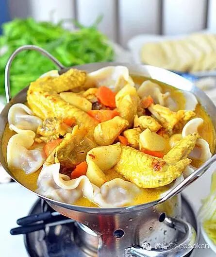 鸡(半只)、胡萝卜(1根)、西红柿(1个)、山药(半根)、洋葱(1/2)、咖喱(四小块)、椰浆(50ML)、淡奶油(1勺)、香叶(1片)、八角(半个)、白糖(1小勺)、饺子(适量)、盐(适量)、食用油(适量)、大白菜(适量)、香菇(适量)、金针菇(适量)、茼蒿(适量)、素鸡(适量)、生抽(适量)、芝麻油(适量)、青椒碎(适量)、红椒碎(适量)、蒜末(适量)