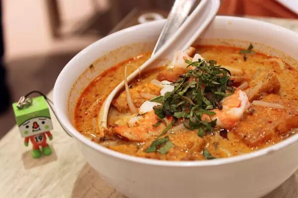 鲜艳的咖喱黄,每一勺都充满浓郁椰浆的香味。里面有着粗米粉、对半切开的白煮蛋、虾、豆芽、豆干和鱼饼,最讲究的还要加上一份新鲜的狮蚶。