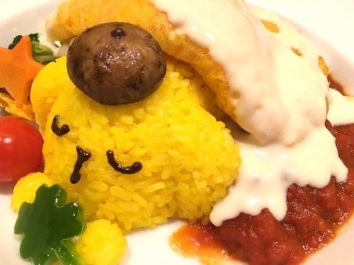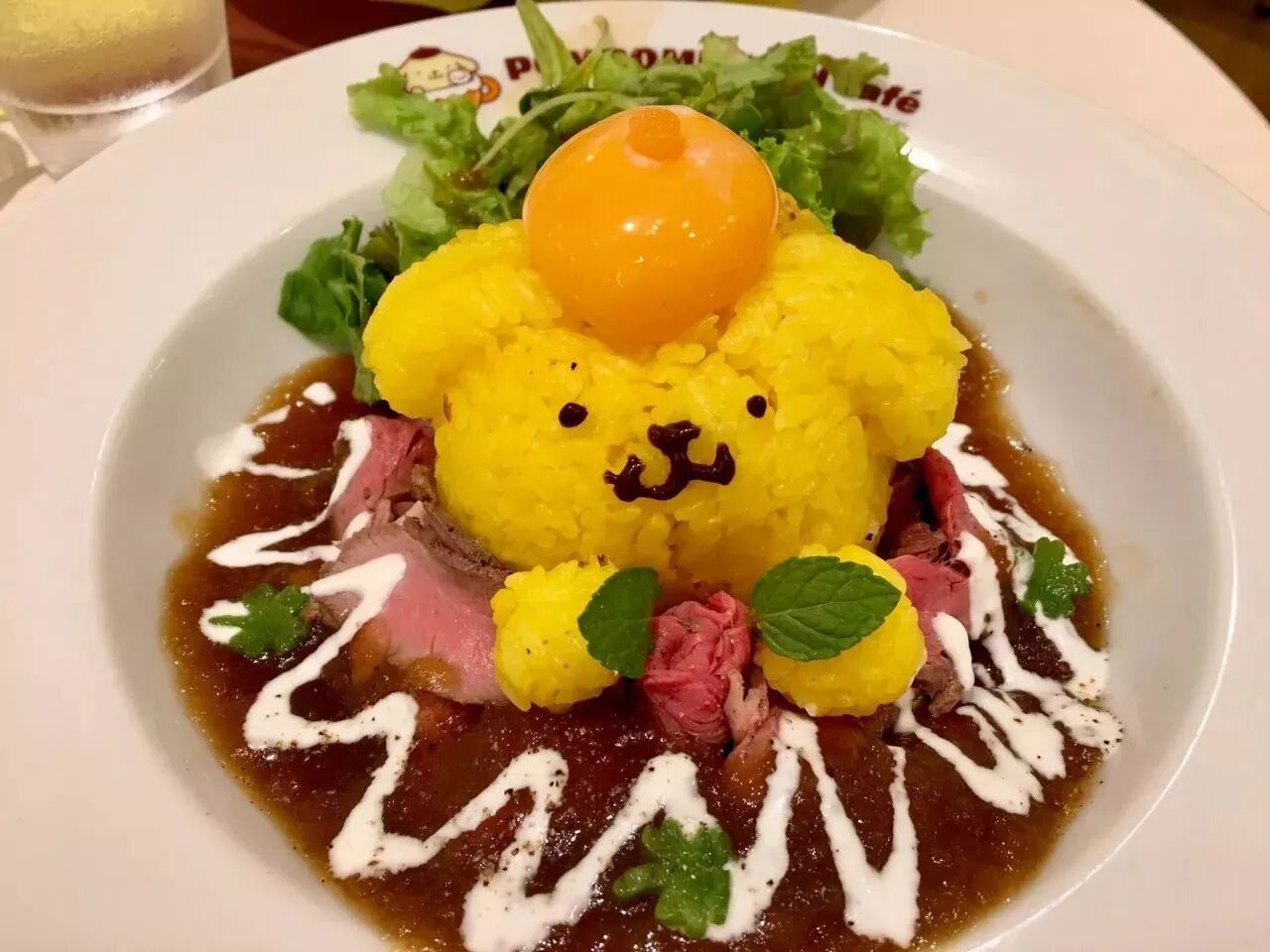 最受欢迎的是布丁狗款式的蛋包饭。盘子中除了有躲在温暖被窝的睡午觉的布丁口,还有被做成各种形状的青菜,细致之极。
