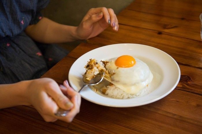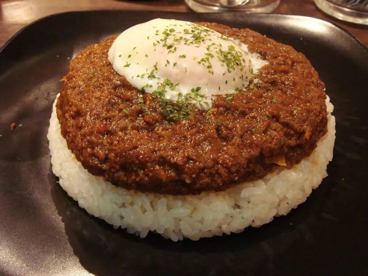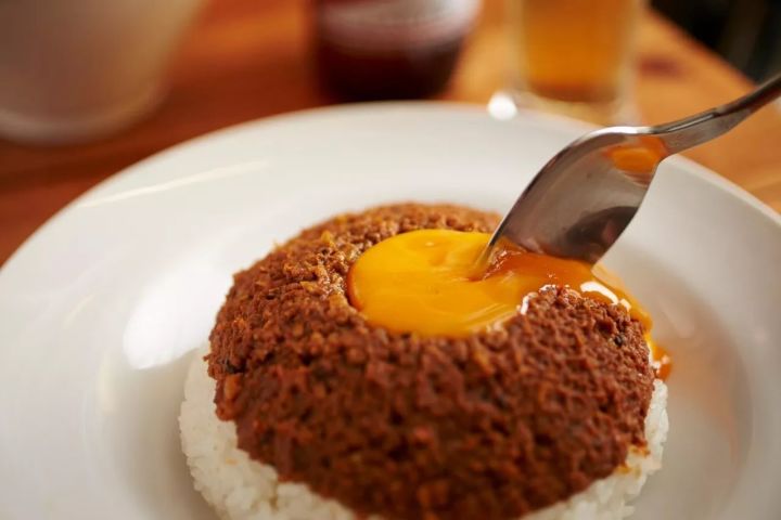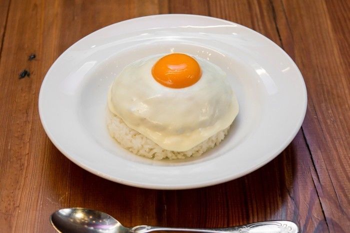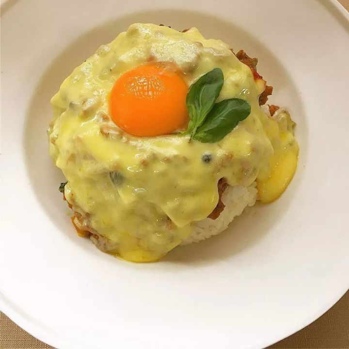 店内最有人气的是起司椰汁咖喱肉酱饭!分量十足的米饭上浇上也只咖喱肉酱,再配以融化后的起司,最后放上生蛋黄,外观看起来就超级美味可爱啊!