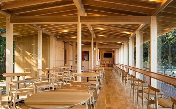 这里明治神宫第一鸟居前的「杜のテラス」有着与大自然合二为一的安心感。店内有着可感受到自然之力的吧台和桌椅,这里用来制作桌椅的木头全部来自明治神宫内枯损的书目,并且有着榉木、青冈栎木、栎木、樟木、樱木5种。