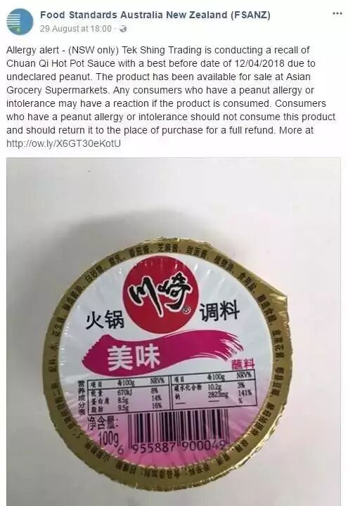 根据澳新食品标准局的网站的信息:该品牌的调料每个净含量为100g,原产地为中国,在澳州的各个亚超中出售,由于没有标明其中的过敏原,因此一旦被对花生、贝类和鱼类过敏的消费者食用,后果可能是极其严重的。
