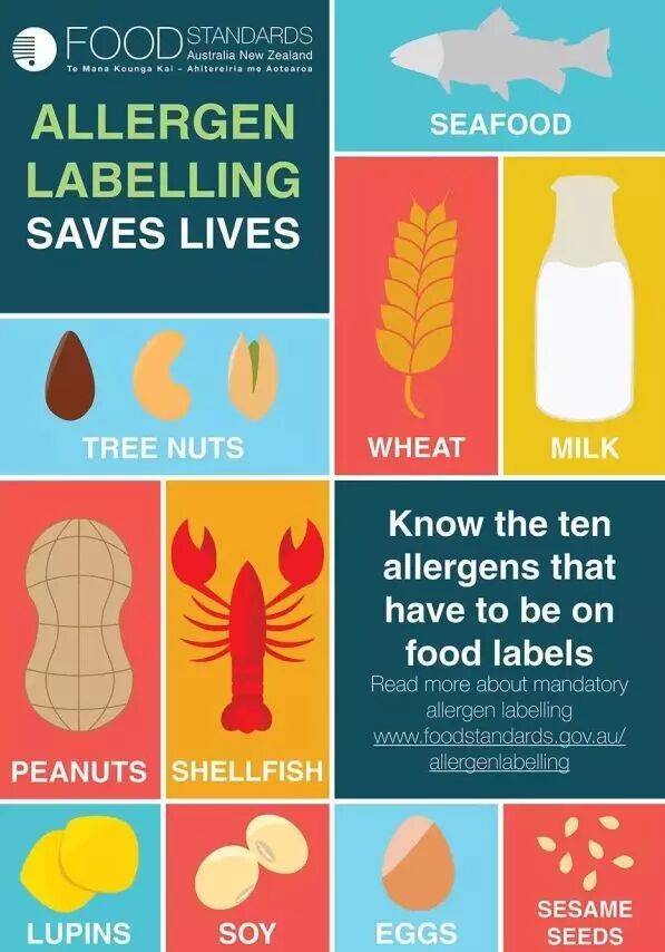 《澳新食品标准法典》规定——任何含有或者在生产过程中可能接触了花生、坚果、蛋类、芝麻、鱼及贝类、豆和小麦以及羽扇豆等成分的产品,都必须在包装上进行标注。