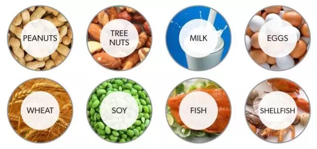 含有麸质的谷物、甲壳纲类动物、鱼类、蛋类、花生、大豆、乳类、坚果等。