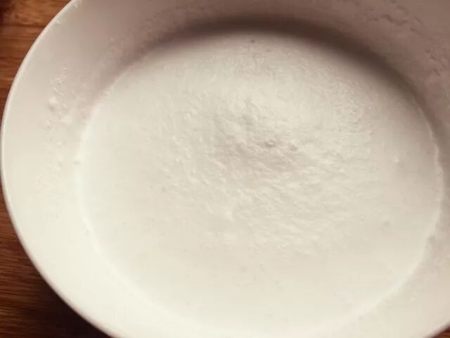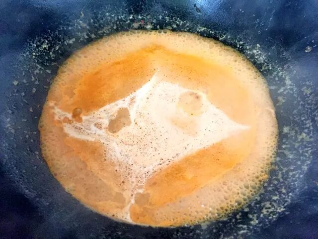 椰粉50g和150g温水调匀(不能用椰汁代替),将红咖喱酱和调好的椰浆混合炒开。