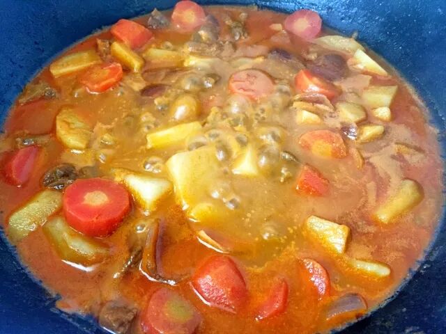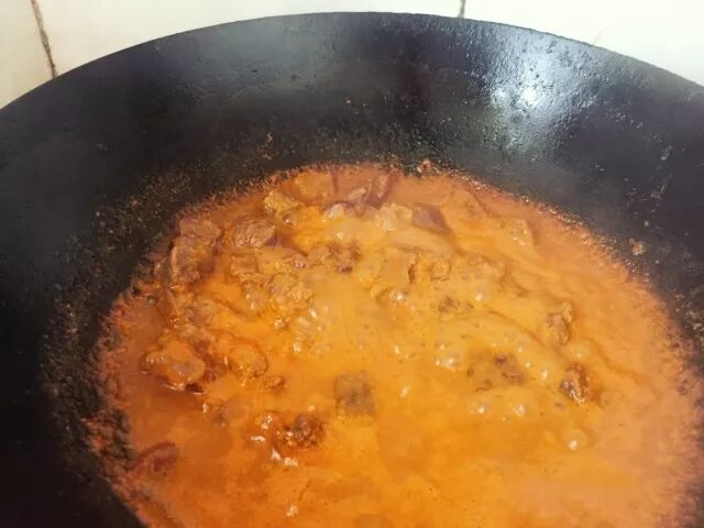 把焯好的牛肉放入咖喱汤汁中翻炒,倒入一碗刚刚高压锅炖牛肉的汤,待汤烧开,下胡萝卜、土豆和洋葱,煮20分钟。起锅前可视情况加鱼露(看个人口味可加糖或者盐)。