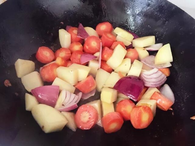 锅里倒一点油,下洋葱、胡萝卜、土豆翻炒至表面收缩,微焦后捞出。