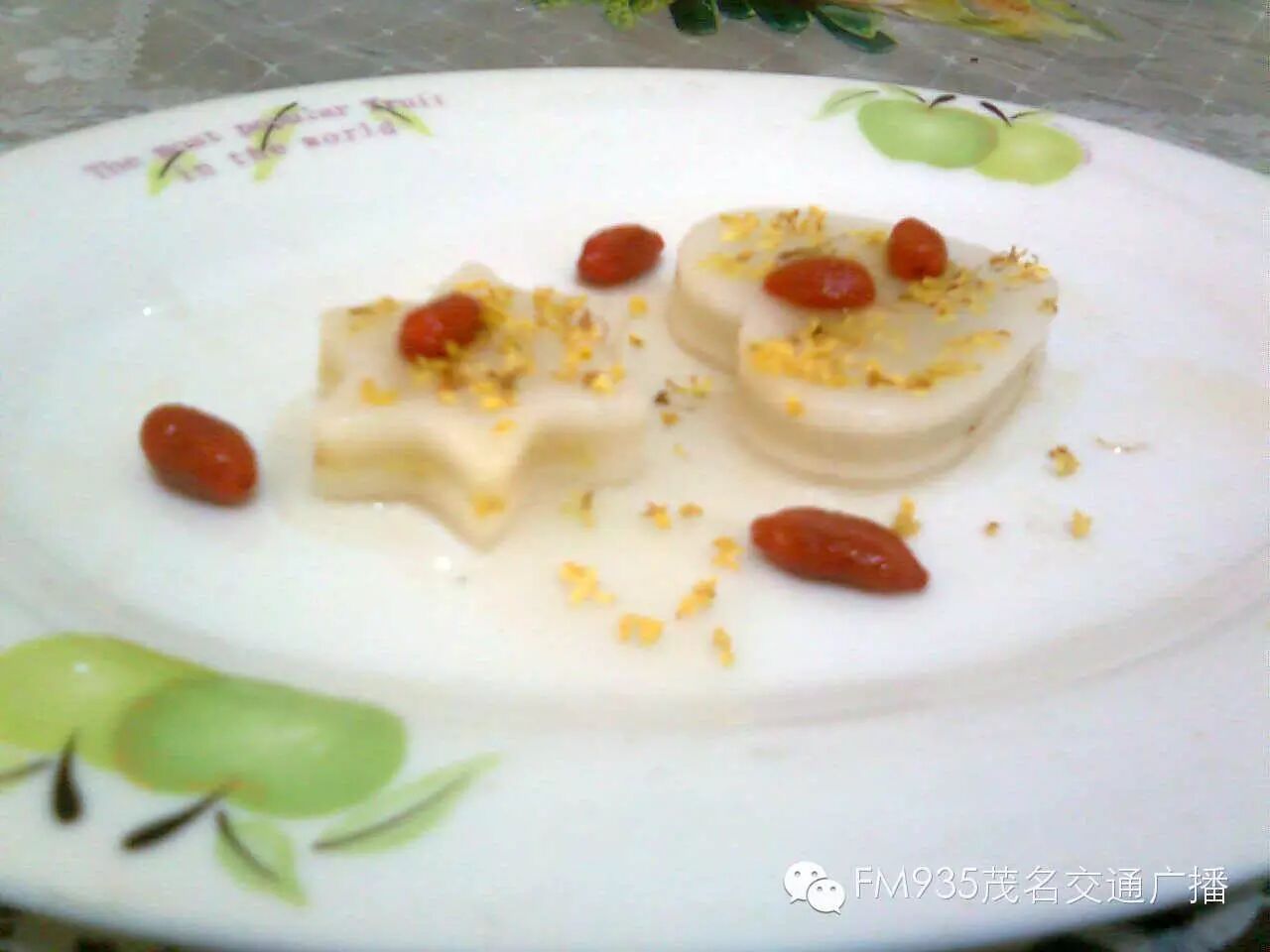 8.倒模后用模具切出形状,洒上几粒枸杞子和干桂花点缀一下即可。