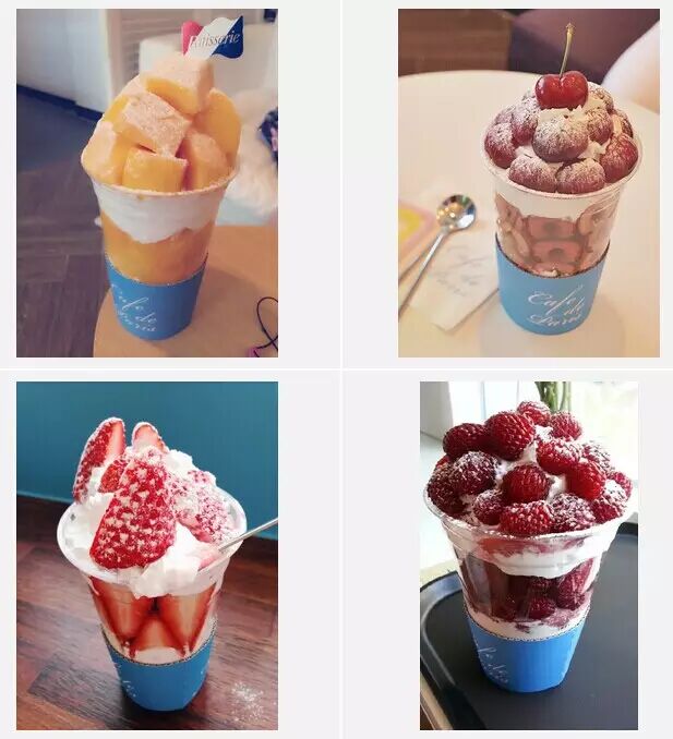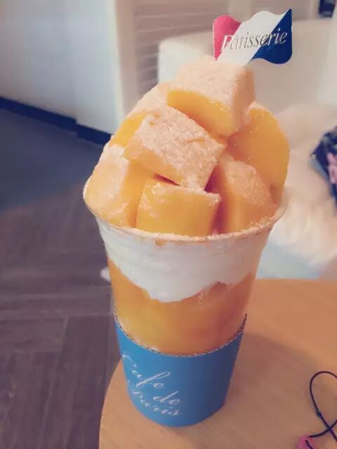 Cafe de paris是位于林荫路的一家咖啡厅。是用整整3个芒果现点现制而成,果肉大块而厚实,加上间隔的奶油和中心的芒果沙冰,酸甜清凉,一口塞进嘴里超幸福!除此之外还有草莓杯,树莓杯,以及短期内供应的樱桃杯哦!售价15000韩币(折合人民币84元,所以韩国留学生说的一点没错啊,在棒国吃水果会要吃出肉价啊)。