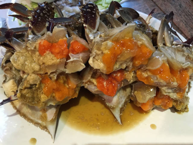 用手抓住蟹脚大口吸食里面的蟹黄,咸中带丝丝甜味的发酵蟹酱背后,是螃蟹本身的鲜香味道。不要介意手和口沾满酱汁。然后用牙直接咬碎蟹壳,吃净里面的蟹肉。又嫩又鲜,美妙无穷,难以言表、吃完蟹肉记得将饭放入蟹壳里,与蟹壳中剩下来的蟹酱均匀的搅拌在一起。