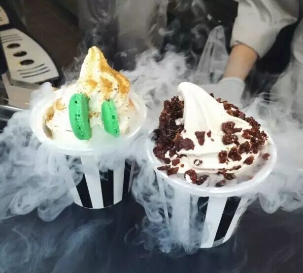 该店主打款乌云冰淇淋人气超高,样子新颖独特,口味也新奇美味。雪白的鲜奶冰淇淋上撒着跳跳糖,堆积着一团形似乌云的薄荷口味棉花糖,还搭配一个超迷你的闪电巧克力装饰,可爱到让人舍不得吃!韩币6100一个(折合人民币34元)。