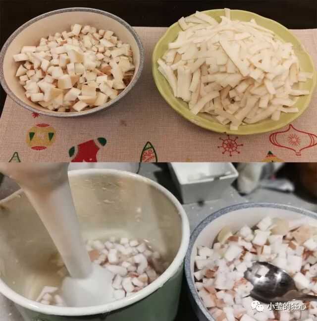 看下图第一格,左边即榨汁前的切块准备,右边一盘是上面完整椰肉尽量切薄片后的效果。