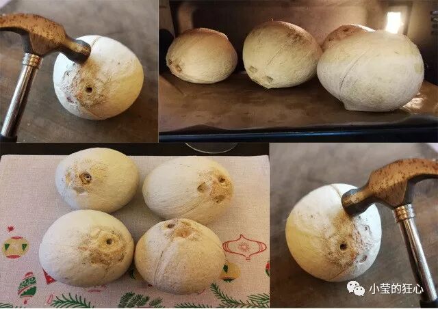 第四步,再次拿榔头敲打。经过冰与火的试炼,这帮椰子终于在烤箱中缓缓散发出香气。这香气渐渐聚集,很快整间屋子就弥漫着经久不散的椰子甜香。