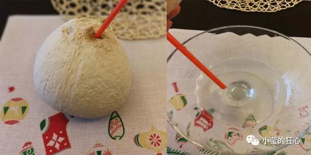 椰子拿到后,会发现它顶端长着类似三勾玉写轮眼形状分布的三个孔。拿小刀戳戳,可以轻松戳开的就是真身了。加入一小段吸管,翻转椰子取汁入碗。