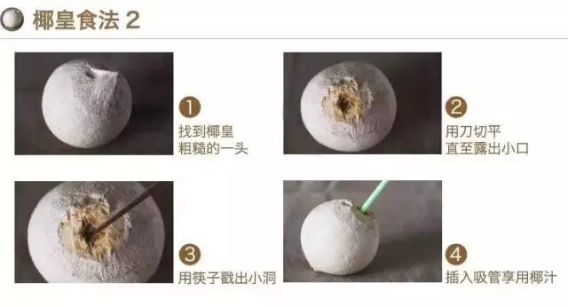 椰子再成熟一点,表皮成黄色后,就叫椰皇,除了喝椰子水外,椰子肉可以挖出来做椰蓉、椰丝、椰子饼。大部分人认为,椰皇才是椰子的精华。