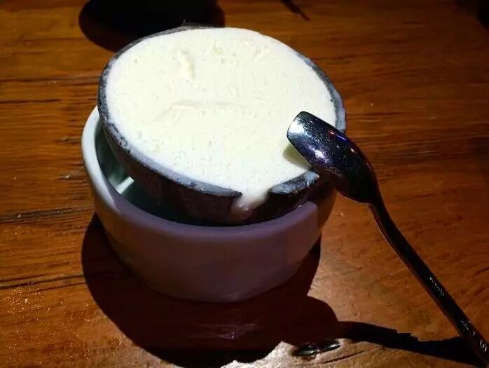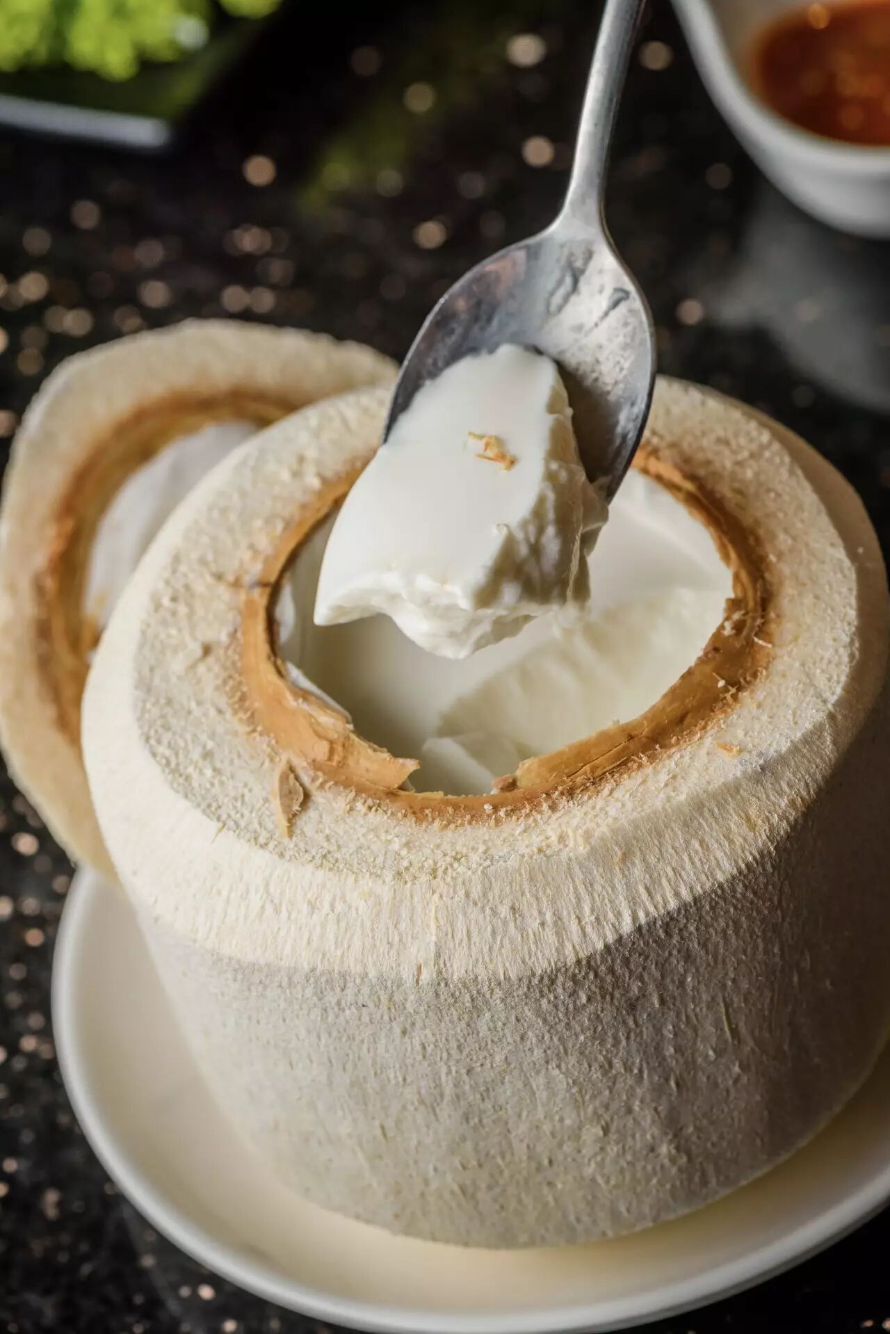 端上桌一整个椰子,打开却发现里面装满了奶冻!45元一颗的价格,也足够2、3个人当饭后甜点分食啦!奶冻爽滑Q弹,椰子香气浓郁,真是来一口就仿佛置身泰国~