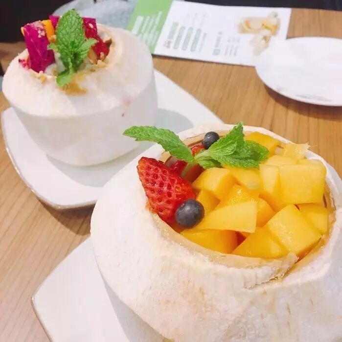 除了整只椰子的视觉震撼,顶上满满的芒果也是诱人的不行~!真椰子为碗,里面有不少水果,椰子、火龙果、蓝莓等,浸泡在椰子汁里,超喜欢这个味道~