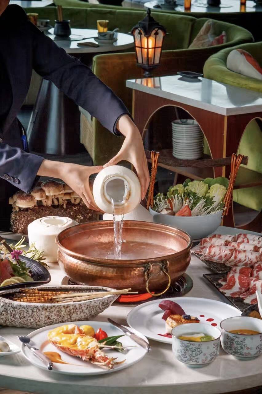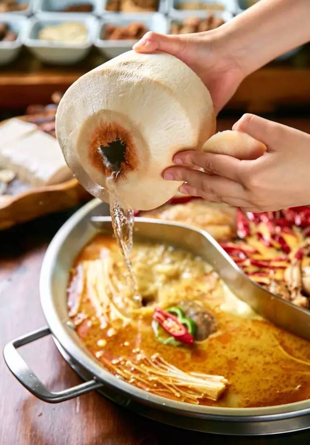 嗨锅的沙嗲锅底,秘密武器就是这一只现开的泰国椰青了,锅底熬制的过程中加入的就是这纯天然的椰子水,吃起来微辣中带着点清甜的椰香,深呼吸仿佛都能嗅到来自东南亚的咸咸海风~
