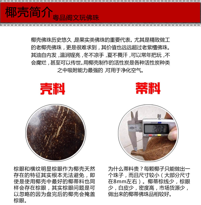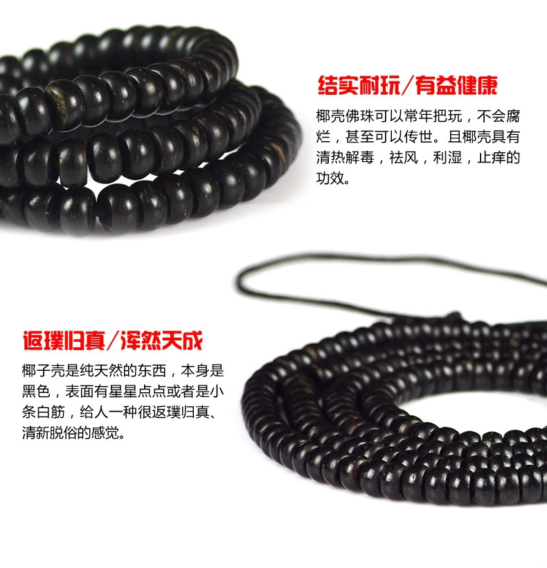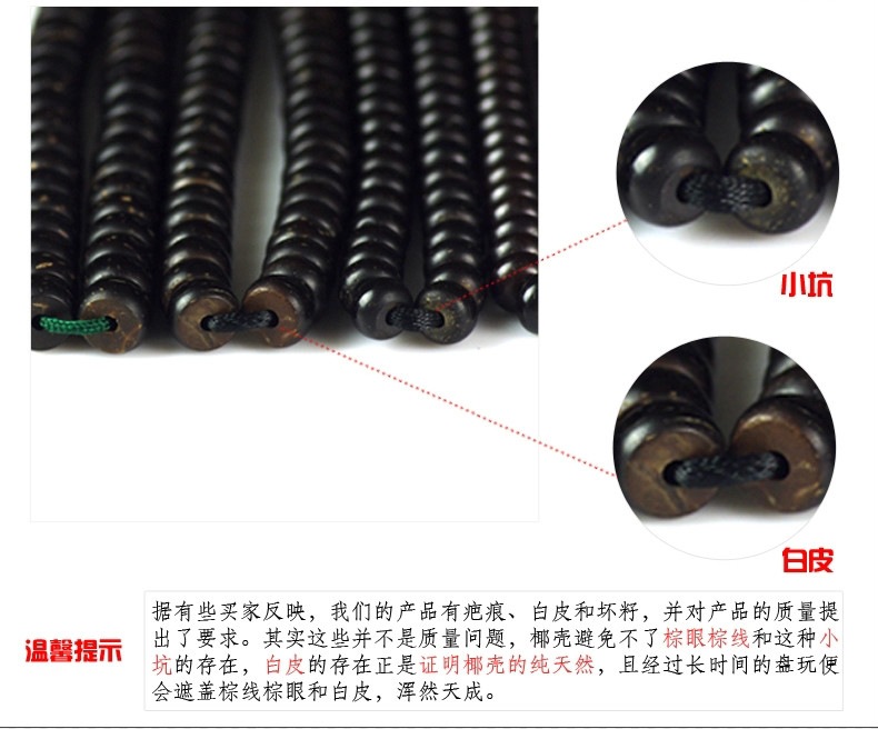 工艺:椰壳玩的是一个手工,纯天然。一看形状,二看光泽、润度,三看成色灰度,四看透亮。现在市面流通一种机滚珠子,就是在珠子初成型后,放到滚筒里滚光,其间有放磨料的,填料的,染料的。其成品原色黑亮,有一层永远去不掉“雾”。