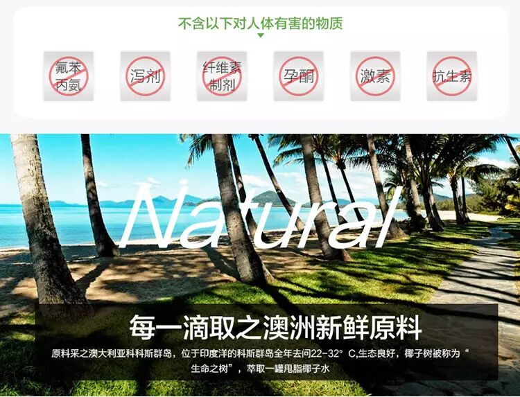 美小柒第一次听说这个椰子水,选择澳大利亚科科斯群岛为主要原料基地,椰子树被称为“生命之树”。所产的未成熟椰子不含脂肪,制成浓缩椰子水可补充人体水分,其成熟椰子饱满多汁,椰子浆富含中链脂肪酸甘油(MCT),可促进人体新陈代谢,具有快速燃烧多余脂肪的作用。