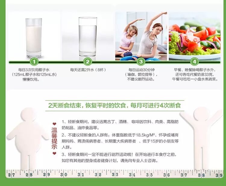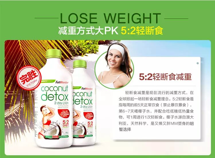 轻断食减重是现在流行的减重方式,在全球掀起一场轻断食减重理念。5:2轻断食是指每周的前5天正常饮食(禁止暴饮暴食),第6—7天喝椰子水,并配合吃低糖低热量食物,可一周进行一次轻断食。椰子水澳大利亚原装进口,天然科学,是想轻松减肥的MM塑身的不二选择。