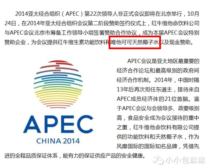 2014年在北京举办的APEC亚太经合国际会议,唯他可可椰子水凭其优良的品质在众多同类品牌中脱颖而出,成为APEC赞助商,为来自二十多个国家的首脑及政要提供服务。