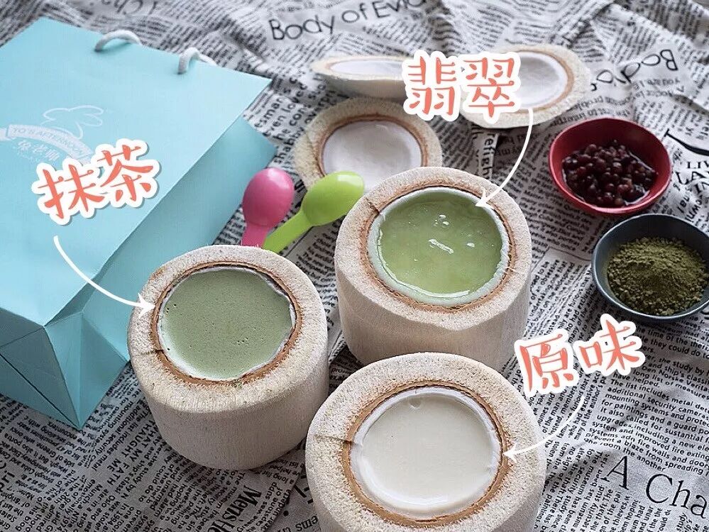 兔老师的椰子冻之所以好吃又健康是因为她家用的是泰国进口椰子,没有生味,开壳去椰青,加牛奶制经过3-4小时的制作时长才能完成的椰子冻,原味椰子冻奶香十足却又微甜清爽不腻口,胖胖个人是非常喜欢的。另外,日常供应的椰子冻口味还有翡翠和抹茶两种。
