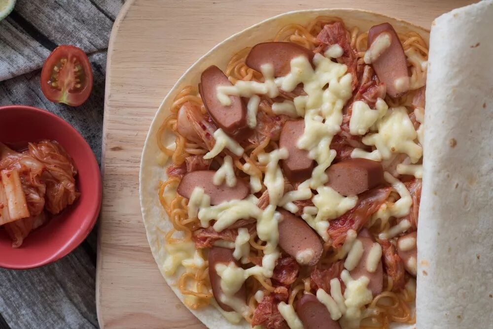 鳗鱼煎饼则是搭配了蒲烧鳗鱼、日式大根碎以及青芥末沙拉蘸酱,味道属于咸中带鲜甜的。而带辣口的朋友就可以选择辣白菜煎饼,里面除了有经典的韩国辣白菜之外,还加入了烤肠、拉面和特调的韩式酱汁,非常带劲儿~