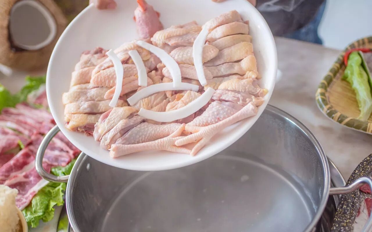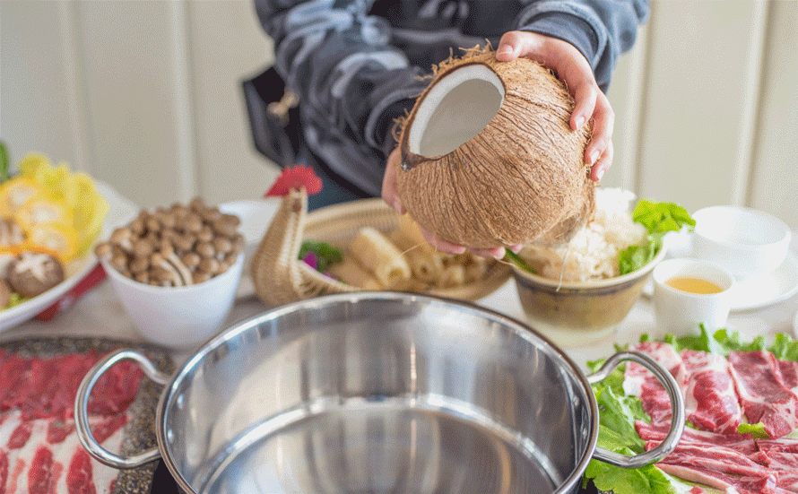 这家的椰子鸡锅底完全是用3只椰子的水做成的,一滴自来水都不会掺加!每个季节的椰子水都有浓淡之分,这个季节吃椰子鸡刚刚好!