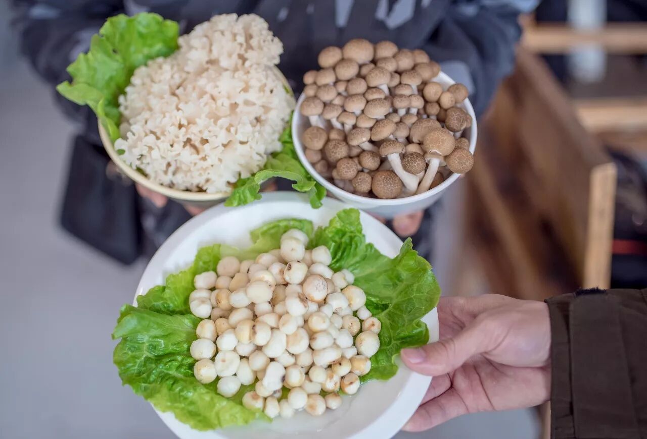 鲜菌棒来自云南,上桌的时候还在生长;绣球菌来自福建,娇贵、营养、味美;小马蹄肉质洁白、清脆可口。