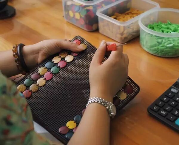 在做工上,这些椰壳小圆片要经过除椰棕、下圆片、分厚薄、抛光等9道工序,把圆片片制成椰壳包的过程,又得经过剪模板、缝椰壳片、缝合、制手提、缝里布等7道工序。