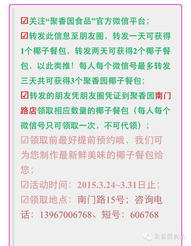 【吃货福利来袭】聚香园椰子餐包疯狂送! 2023-04-19 23:50:29 微生活衢州2014感谢大家的一路相伴2015年将继续努力前行呈现全新的精彩聚香园食品感恩大回馈,椰子餐包疯狂送活动开始了,活动时间为2015年3月24-31日止;请朋友们看准时间哦!,聚香园食品感谢一路有你的支持参与方式☑返回顶端点"聚香园食品"关注后参与店内活动:订生日宴送生日蛋糕,详情咨询:13967006768,短号:606768;会员充值200元送56元DIY蛋糕一盒;会员充值500元送156元DIY蛋糕一盒;多充多送,欢迎新老客户光临惠顾!聚香园介绍:1998年创办至今,江山市聚香园食品有限公司前身是江山市聚香园西饼屋,是一家专业以蛋糕、面包、西点、月饼等生产、加工、销售为一体的食品加工企业,现江山市区有6家连锁店,其中总店位于市区南门路15号(一至二楼),是一家中西复合式大型饼店。为了促进企业发展、提高企业形象、明确企业定位,你钟情的聚香园商标注册为衢香园啦,微小的改动是为了给您更好的味道~ 美食热线:400-926-0508、13967006768(短号606768)南门路总店:0570-4015156地址:浙江省 衢州市 江山市 南门路15号解放南路店:0570-4025125地址:浙江省 衢州市 江山市 解放南路114号鹿溪中路店:0570-4022138地址:浙江省 衢州市 江山市 鹿溪中路105号鹿溪北路店:0570-4110050地址:浙江省 衢州市 江山市 鹿溪北路95号江东大道店:0570-4022098地址:浙江省 衢州市 江山市 江东大道88号城中路店:0570-4018897地址:浙江省 衢州市 江山市 城中路12-1号-THE END -@微生活衢州 | 2015年3月25日 | 微信号 wsh-qz「欢迎转发到朋友圈」