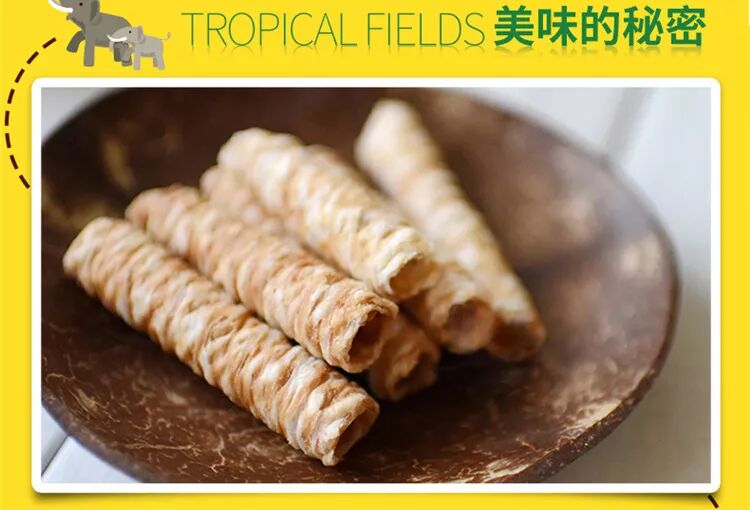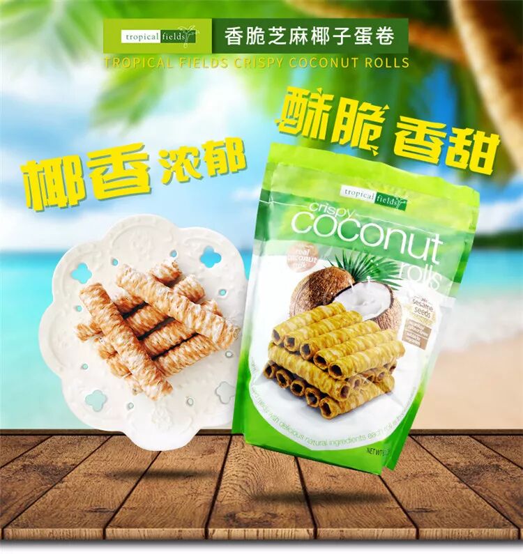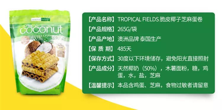 【奶爸海外精品推荐】原味无添加,绝对不是国产蛋卷的味道! 好吃到根本停不下,应该是我吃过最好吃的椰子卷啦,澳洲tropical fields,椰子卷,真正的纯真椰奶做的,浓浓的椰子味+芝麻的香脆,吃货们一定不能错过。没有普通的蛋卷那么甜,香甜口感,煲剧必备,一袋可以吃到天荒地老的感觉!早餐加到牛奶里当作麦片吃,真心美味,妈妈再也不用担心我的早饭了。