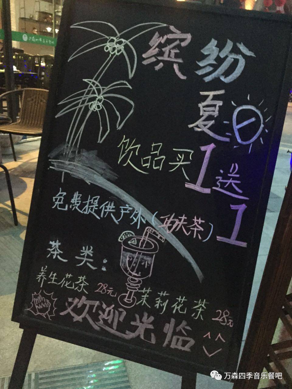 万森四季椰子鸡音乐餐吧(优惠活动) 2023-04-19 23:50:29 万森四季椰子鸡音乐餐吧为答谢新老顾客即将推出缤纷夏日清爽饮品:本店所有饮料饮品买1送1(除灌装酒水饮料外)关注万森四季椰子鸡音乐餐吧公众号更多精美小吃、饮品即将推出~预订电话:0754-89398470 ~地址:汕头市潮阳区棉北街道中信华庭卜蜂莲花地下停车场对面