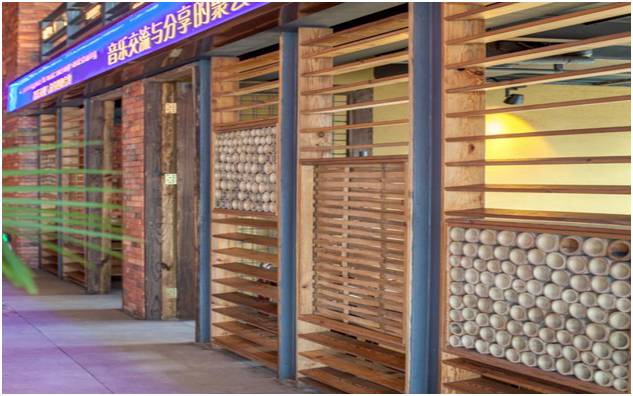 墙面运用了粗细不一、样式各样的木艺进行了墙面装饰,还有颜色耀眼的电子屏幕带动着音乐一起,在享用着椰子鸡的同时伴随着音乐,使顾客可以在心理和生理上同时被满足。