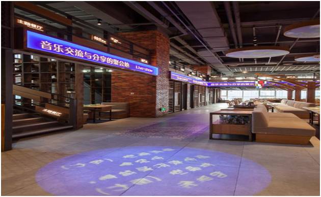 舞台上有各类灯饰的照耀下让顾客在享受美食的同时可以像置身在演唱会中的氛围一样,头顶还有海景的装饰物让顾客一抬头就仿佛看到海景一般。