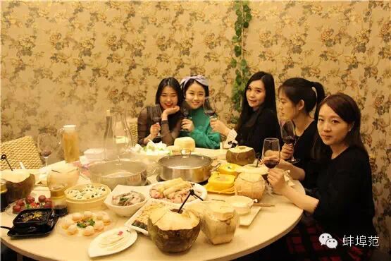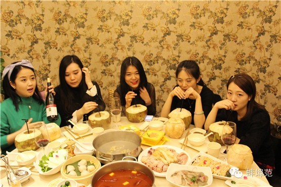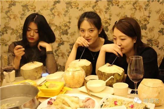 要不要吃个饭都那么美!美女吃饭的时候就是很淑女...上了热腾腾的火锅,美女们很是兴奋。第一次品尝椰子鸡火锅,她们赞不绝口,鸡肉鲜嫩,汤底清甜。对于椰汁,他们觉得这是在蚌埠喝过最新鲜的椰子。