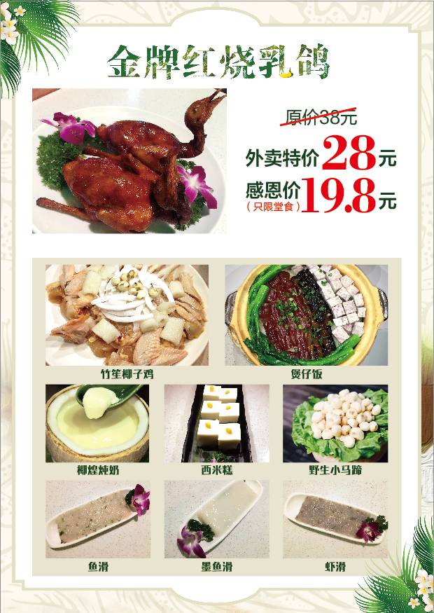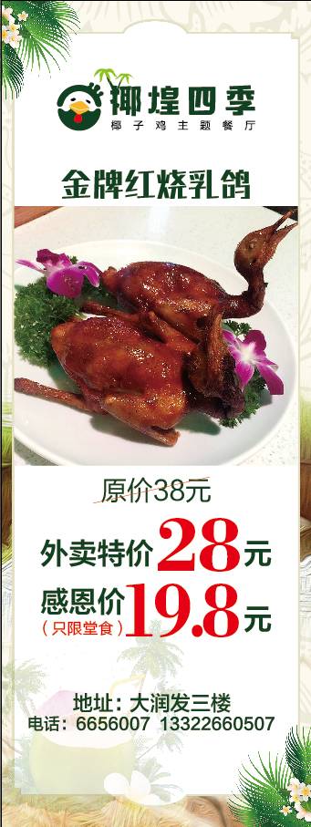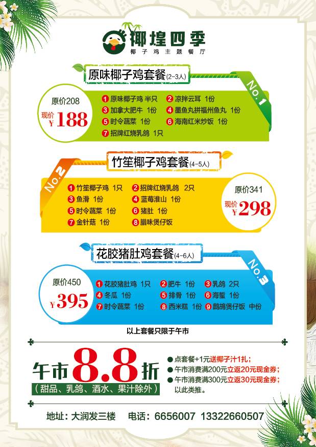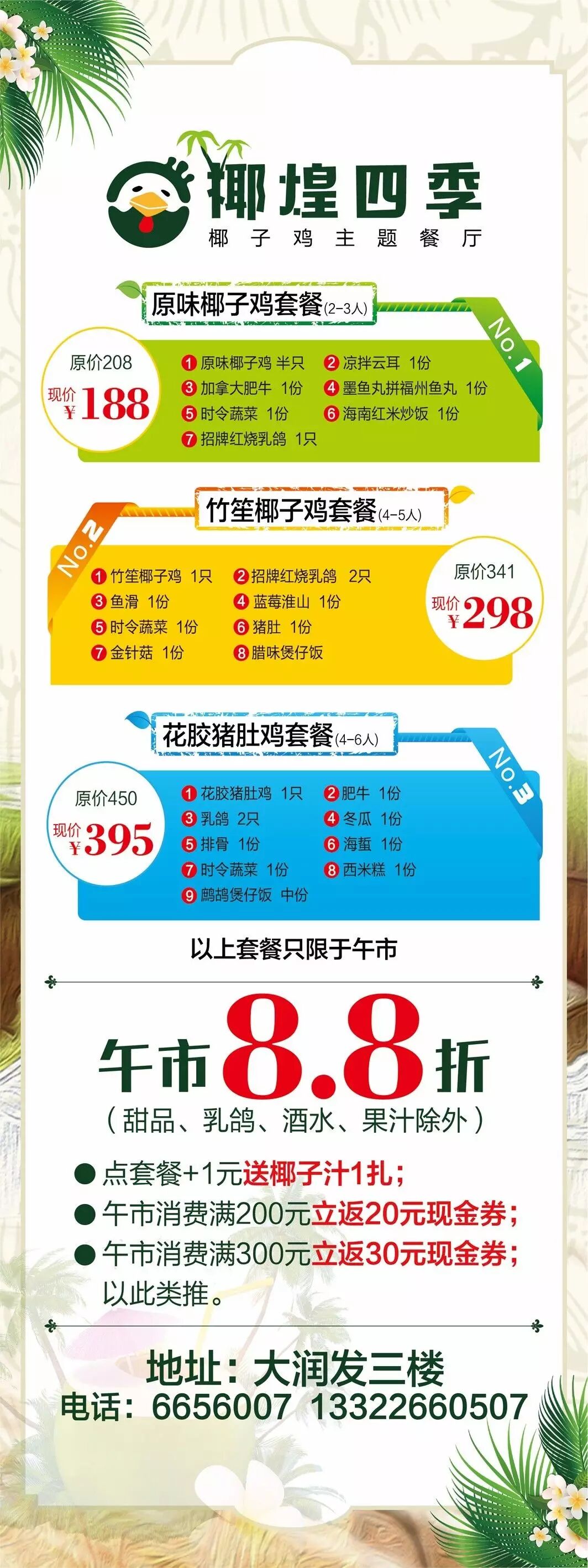 丰顺“椰煌四季”椰子鸡主题餐厅推出精品套餐啦! 2023-04-19 23:50:29 椰煌四季推出精品套餐啦!即日起,午市8.8折,夜市9.5折,还送现金券!这里用100%新鲜椰子汁做锅底不加水全程公开透明,绝无任何添加!为的就是让你吃得放心!精选靓鸡,原只端上肉质细嫩,易熟易入味~加三四条鲜椰肉,关上锅盖开火5分钟汤底越煮越甜,煮好后一定要先喝汤再吃鸡哦~鸡肉肉质滑嫩,肥而不腻 清香润胃蘸点酱汁吃简直好味得不要不要的!美味招牌煲仔饭