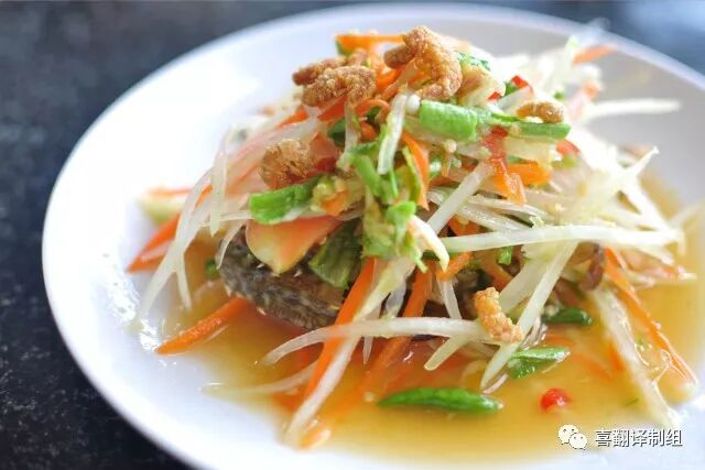 这道奇异的菜品属于味蕾的分水岭——有些人觉得“哇”,如此美味;有些人便觉得难以下咽,实在泾渭分明。用杵和臼将蒜、辣椒、青豆、圣女果和生木瓜片捣碎,散发出的甜酸辣味令人难忘!(希望钟爱独特美食的喜饭们可以去试试哦~)