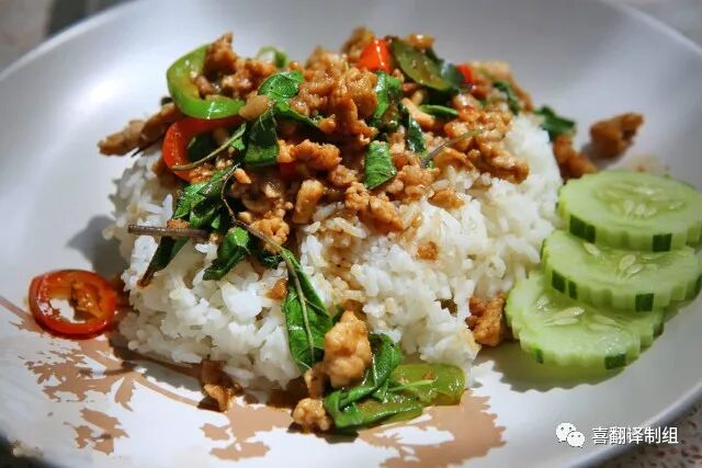 一口热锅,大量的圣罗勒叶、大个鲜辣椒、猪肉、青豆、酱油以及略微一点糖即可烹饪这道菜肴。丰满的猪肉碎油脂丰富,搭配热气腾腾的白米饭,让人格外满足。简直就是下饭神器,比老干妈还老干妈!