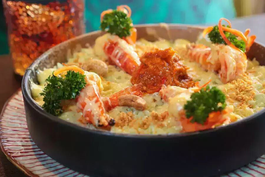 香兰叶海鲜饭,据说是点击率极高的菜。香兰叶(泰语就是Pan Dan),是东南亚料理中常见的一种香料。它本身带有清甜的香气,性格也像极了那些曼妙的少女,让人感到甜美而柔情。优质的泰国香米加上椰奶煮出来的饭,粒粒分明又椰香十足,加入了香兰叶这种天然着色体就变成了嫩嫩的浅绿色。饭的顶部铺满煮好的虾肉,再撒上一把马苏里拉芝士,焙烤后就被端上桌了。吃的时候一定要趁热,冷了就没办法做“拉丝表演”了,同理也适用于所有带这种芝士的菜呢。