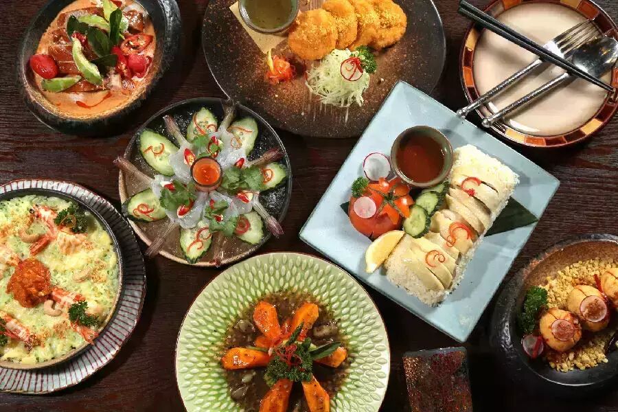 生如虾花(88元)、泰式炸虾饼(58元)、香兰叶海鲜饭(58元)、蒸南瓜黑松露(48元)、鸡蛋假装恐龙蛋(28元)、红咖喱牛油果烤鸭(78元)
