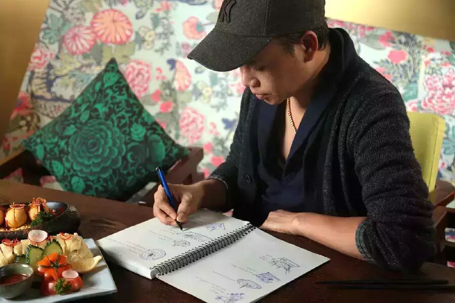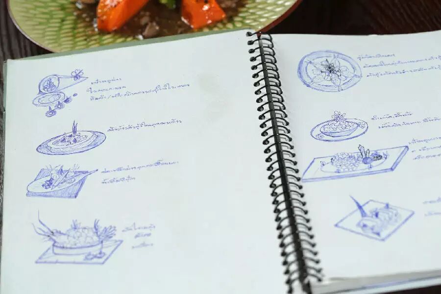 经他之手的泰国菜不仅味道纯正,还有许多构思精巧的细节融和在菜式里。所有菜品都是经他事先构思,手绘之后再按照绘图去摆盘。所有的菜不仅好吃,还要满足一个条件:视觉上要美。