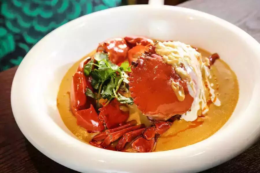 咖喱,这种以姜黄为主料,又另加入如芫荽(yán sui)、桂皮、茴香等多种辛香料配制而成的复合调味料,是最能体现一家泰国菜是否地道的不二准则。青咖喱鸡、黄咖喱蟹、还有红咖喱的各种牛肉,都是耳熟能详的菜式。毫不犹豫点了黄咖喱蟹,经典菜肴中的战斗机!黄咖喱酱中加入了鸡蛋一起翻炒,极香极下饭。十碗米饭,谢谢!