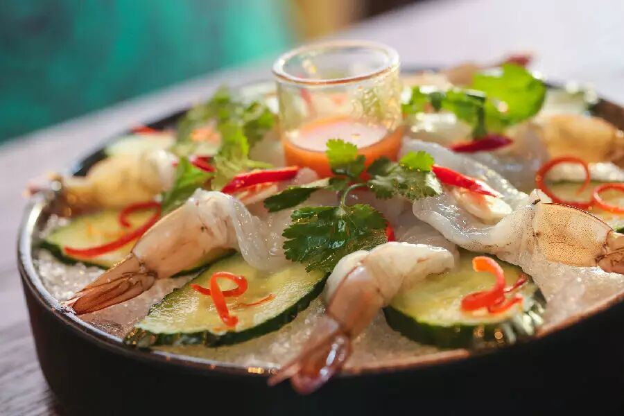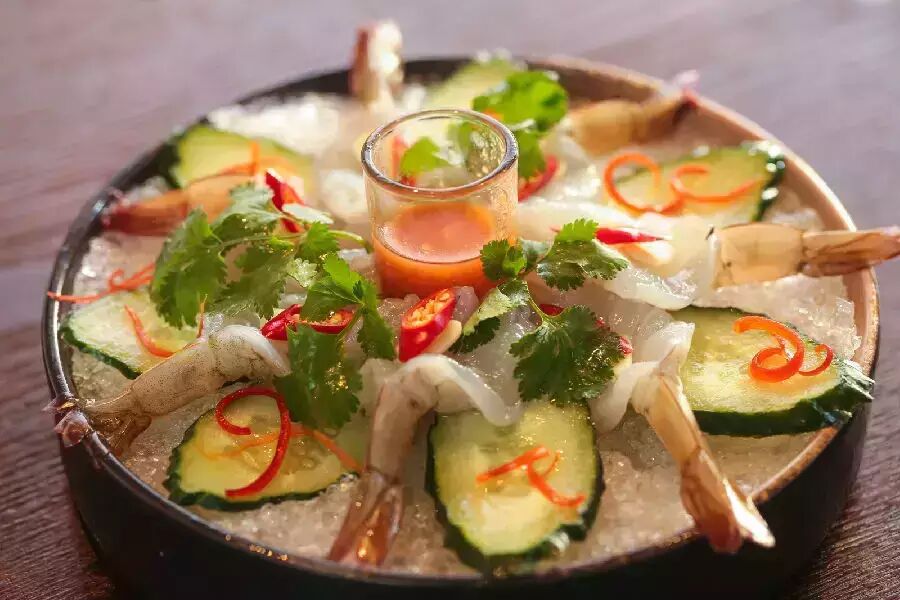 吃的时候,我更喜欢借助一把汤匙:将虾肉、黄瓜片、生蒜片、辣椒碎和薄荷依次铺上,浇上些shot杯里的特调辣椒酱,一口咬下。生蒜的冲加上泰椒的辣,让人瞬间食欲大开。酱料里的柠檬汁带来浓烈的酸味,更加激发出了虾肉的甘甜。薄荷也是神来之笔,只一点就是满满的清新感,宛如安达曼海上的一缕凉风。