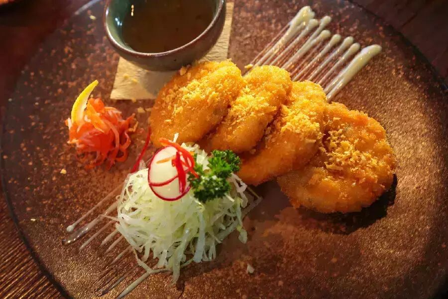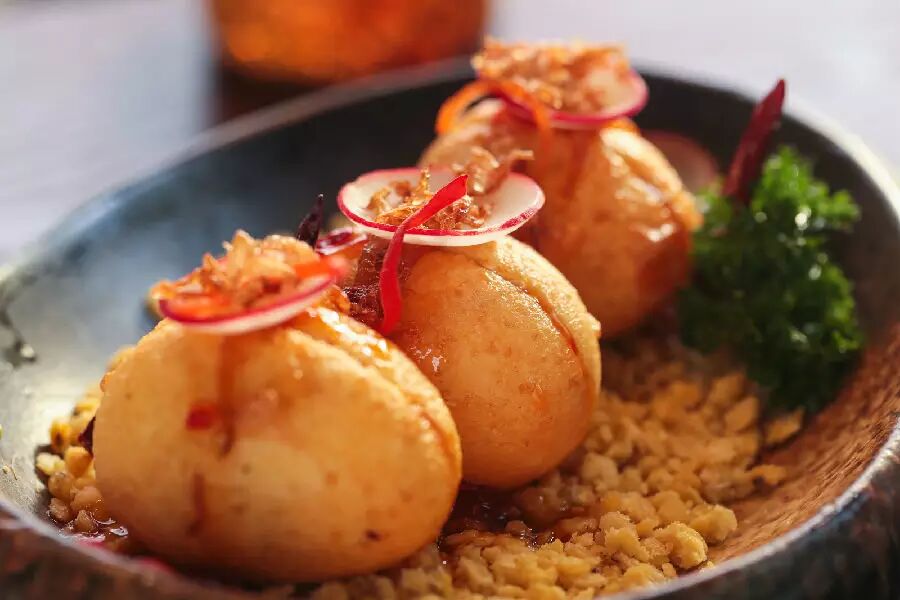 鸡蛋假装恐龙蛋,取名有趣,应该是将鸡蛋事先预煮后去壳放到油锅里大火炸的,出锅就是金灿灿的虎皮蛋了。蛋白的部分吃上去弹而韧又微微脆,配的酱汁由罗望子调配而成。所谓罗望子,其实就是我们俗称的酸角,又名泰国甜角,其味酸中带甜,还带有些许桂圆的迷人芬芳。用罗望子做调味剂在泰国菜中十分常见,带来丰富的果香味的同时,有酸甜微妙的爽快口感。