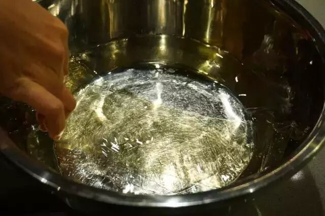 2. 把浸软的鱼胶片放入热水中,轻轻搅拌使其彻底融化;