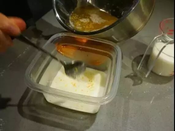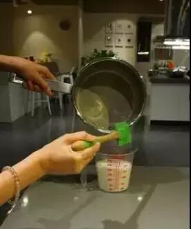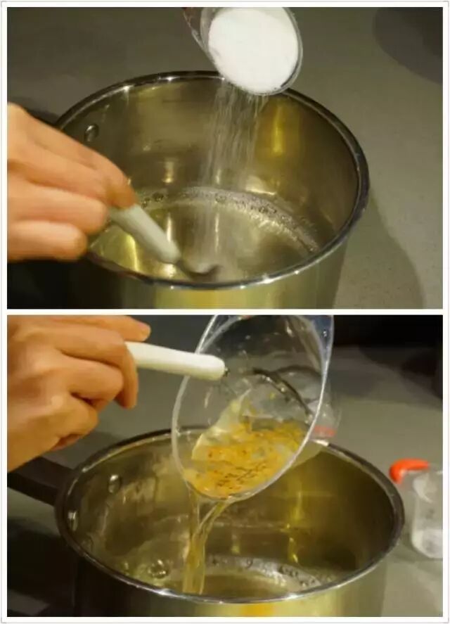 4. 把混合好的液体倒进干净的容器中,放置一边冷却;