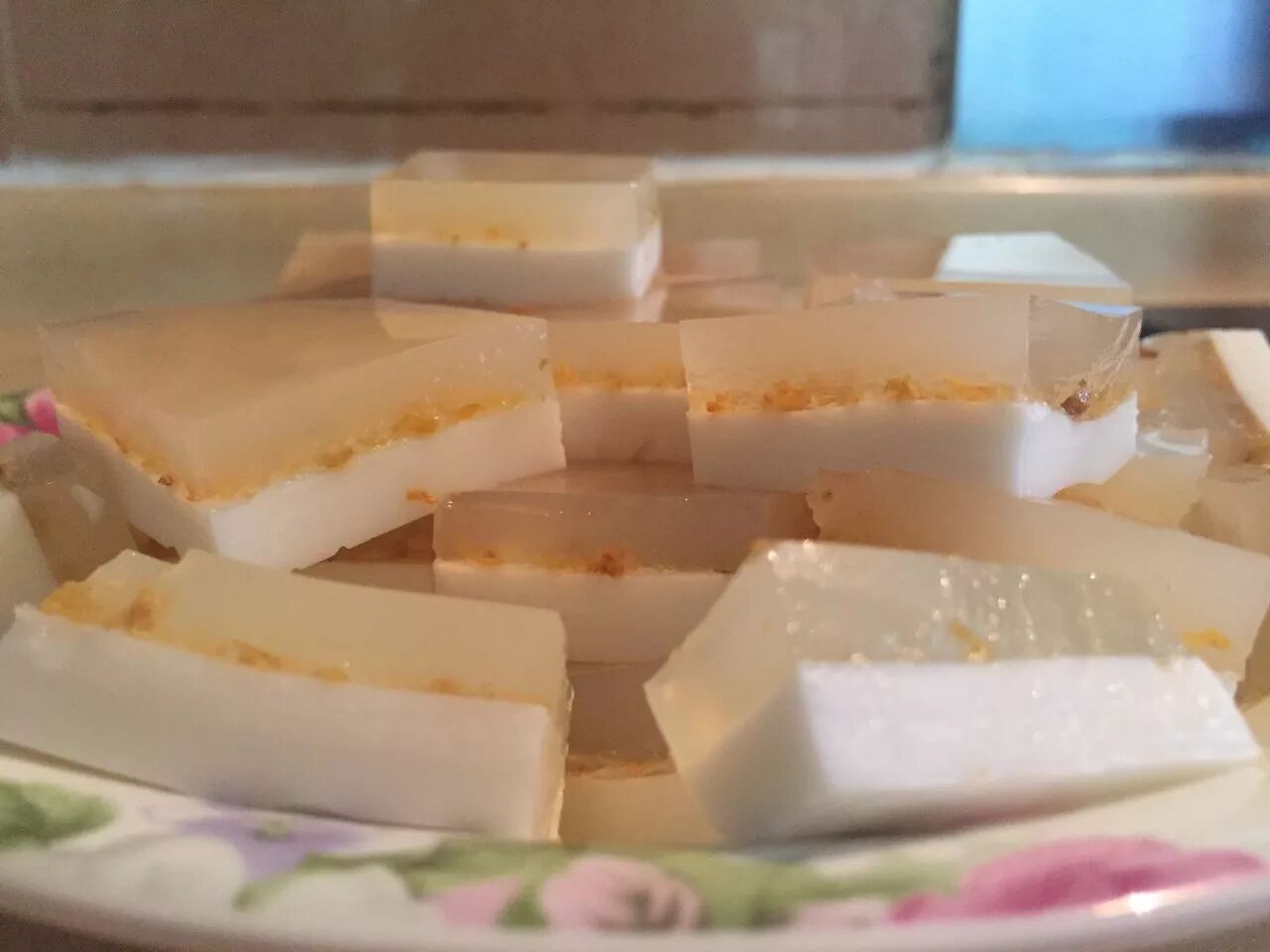 4.拿出冰冻好的椰奶层,将桂花层液体冷却后铺到椰奶层上,放入冰箱冷藏5-6小时
